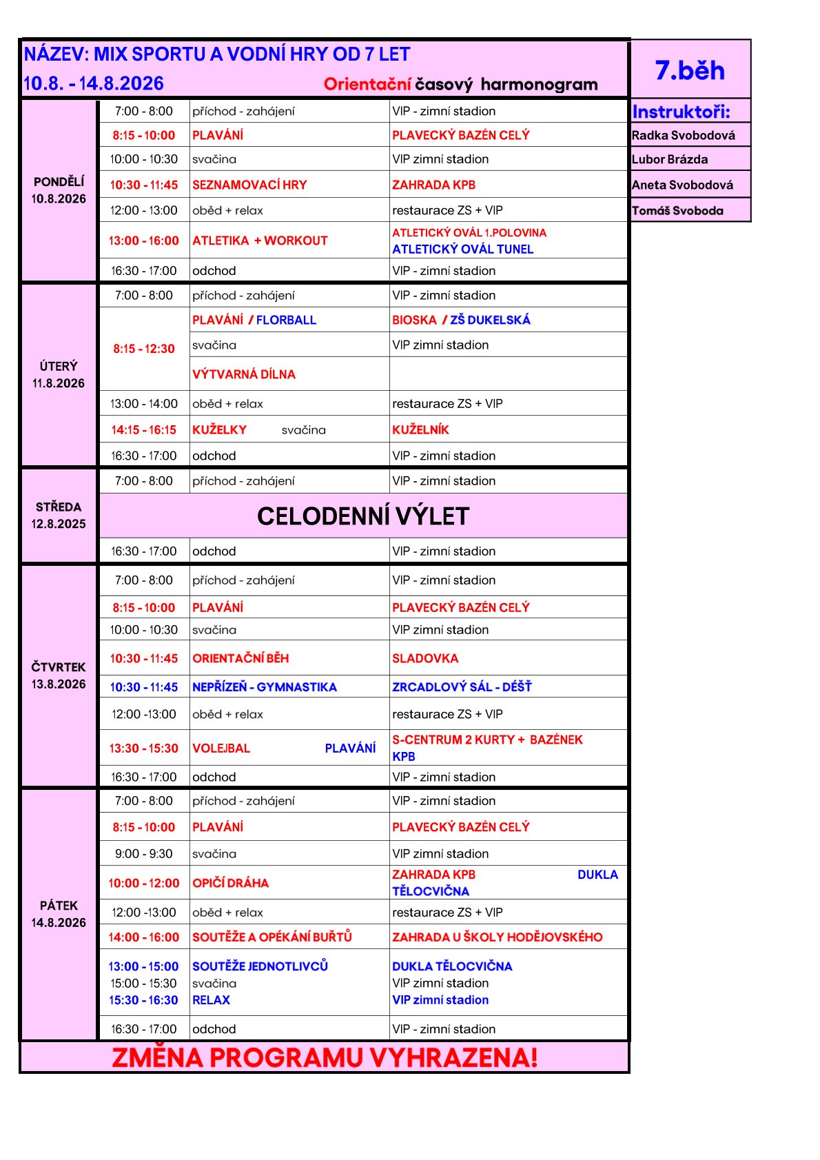 Mix sportu a vodní hry, 10.8. - 14.8.2026