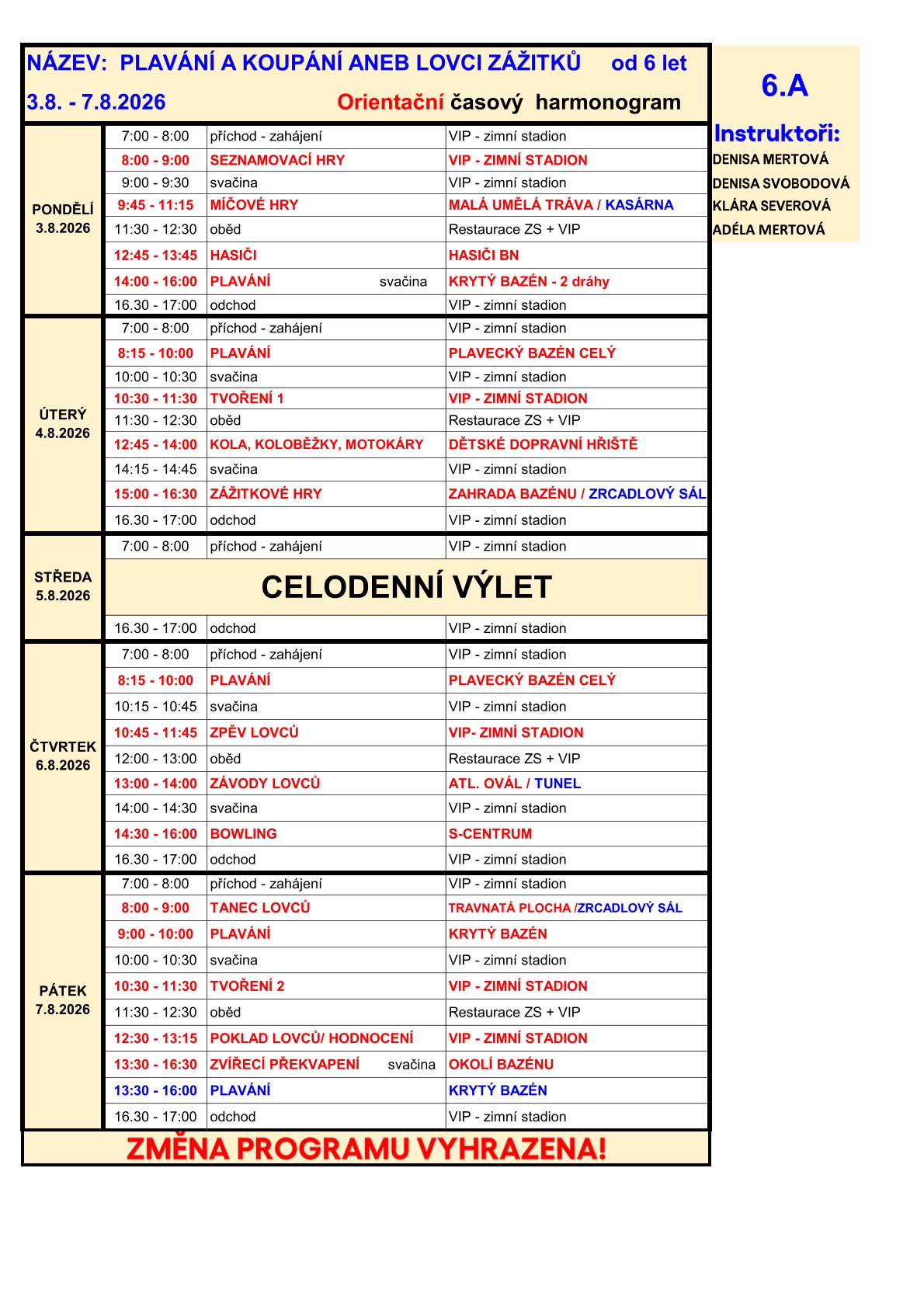 | Aktivita: | Sportovní hry a míčové hry, příroda, procházky, tvoření a dílničky, Plavání, vodní hry |
